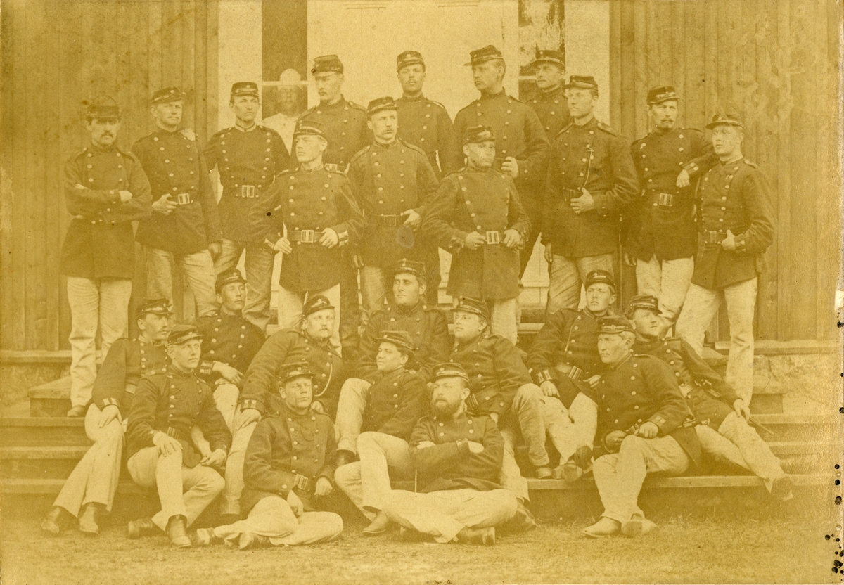 Grupporträtt av värnpliktiga vid Hälsinge regemente I 14 i Mohed 1883-1884.