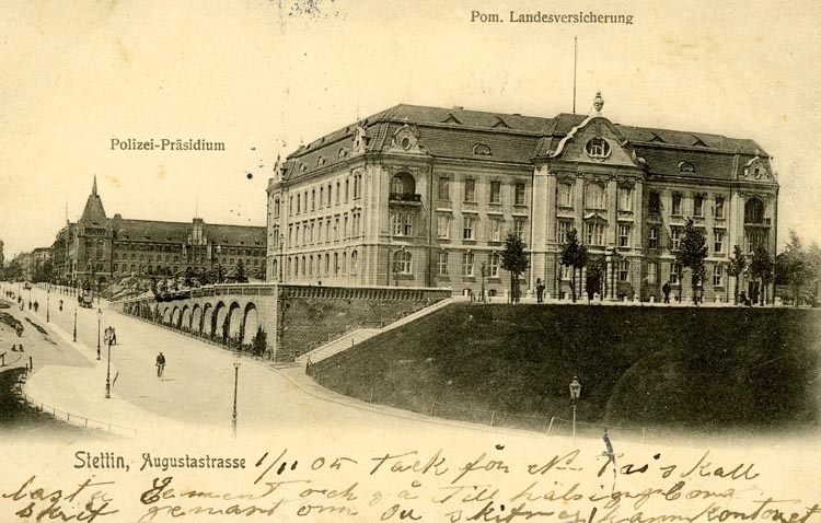 Notering på kortet: Stettin Augustastrass. Polizei Präsidium. Pom. Landesversicherung.