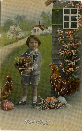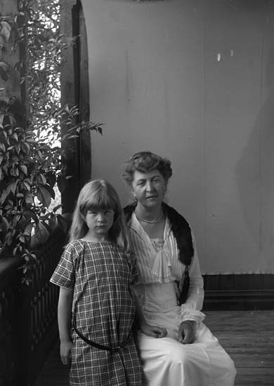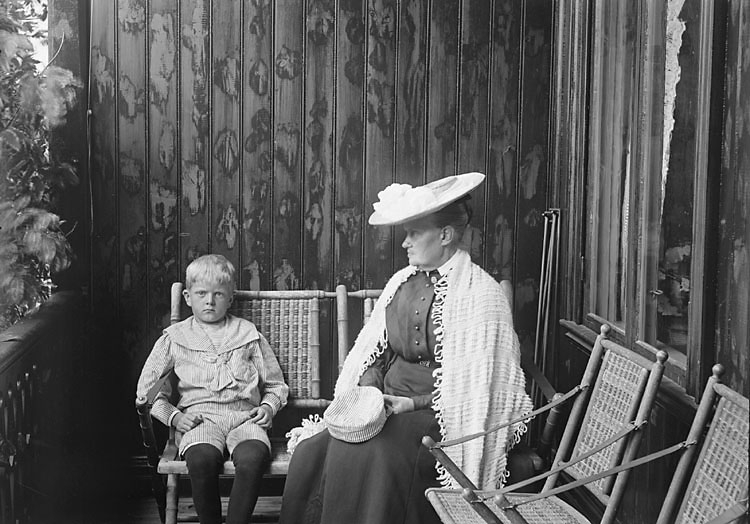 En äldre kvinna klädd i en platt bredbrättad hatt och med en sjal runt axlarna, sitter tillsammans med en ung pojke i "sjömanskosym" på en veranda.