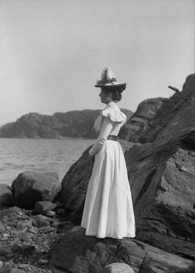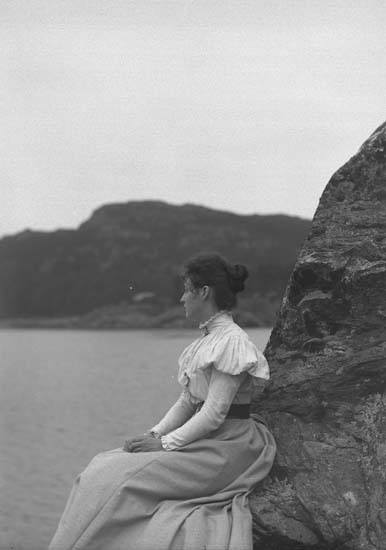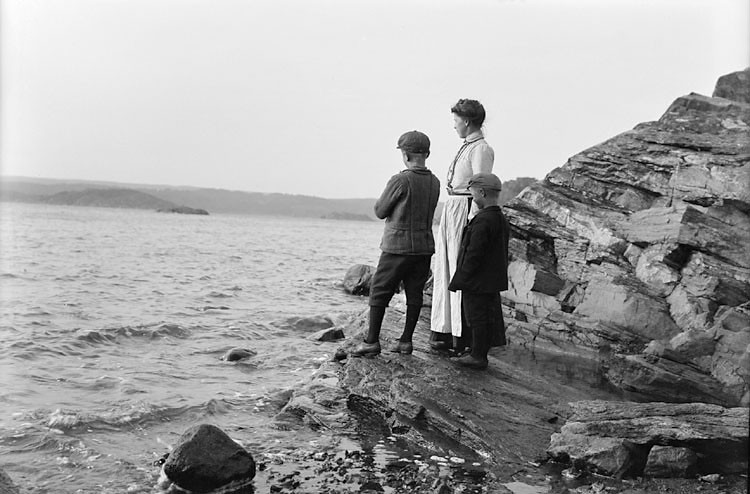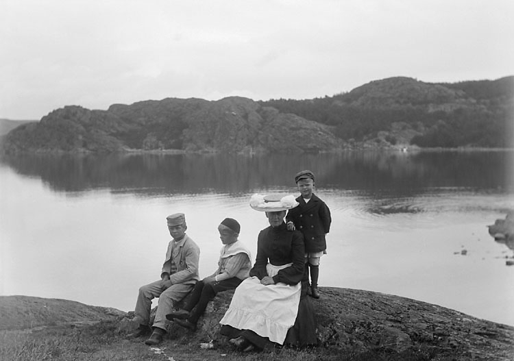 En kvinna och två pojkar sitter på en klippa vid vattnet, och bakom ryggen på kvinnan står ytterligare en pojk. Kvinnan är klädd i lång klänning, förkläde och en stor hatt.