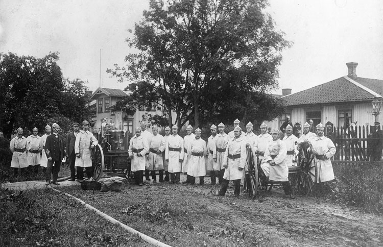 Enligt tidigare noteringar: "Avfotografering av foto av A. Hansson, 1905 av Uddevalla brandkår vid Södra Drottninggatan 8."