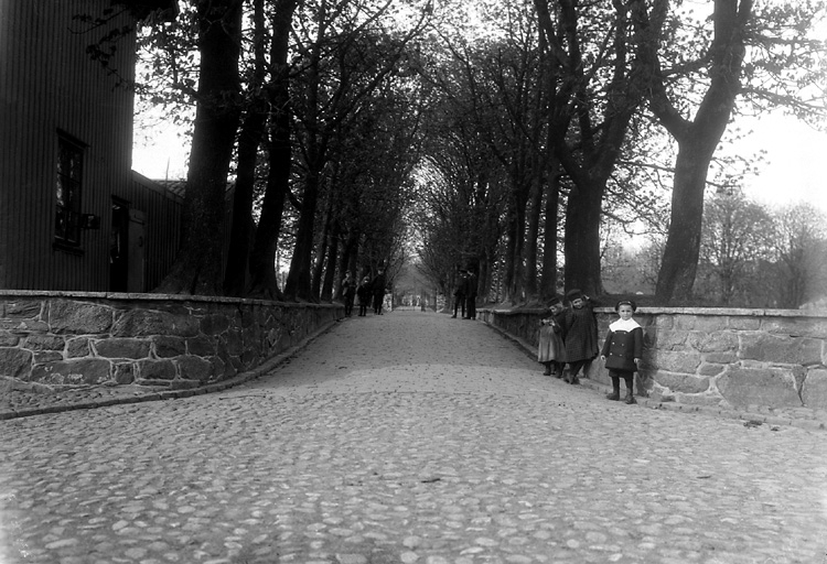 Enligt tidigare noteringar: "Uppfarten till Norra Kyrkogården från söder, barn vid muren."
