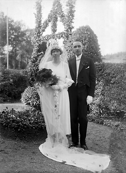 Enligt noteringar: "31 juli 1929. Brudparet Gösta Hugo Ramsten och Linnea, f. Moberg, (bägge musikdirektörer?) utanför förvaltarbostaden, Torreby.