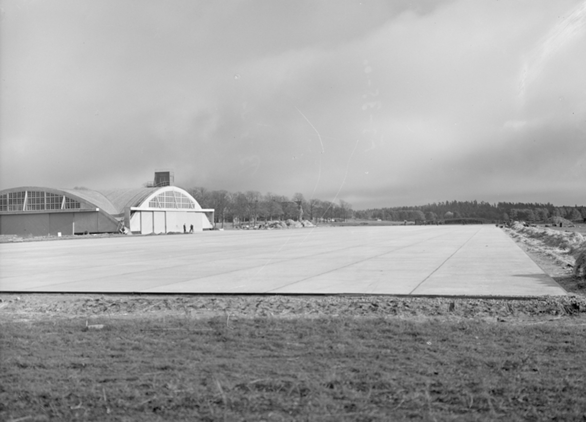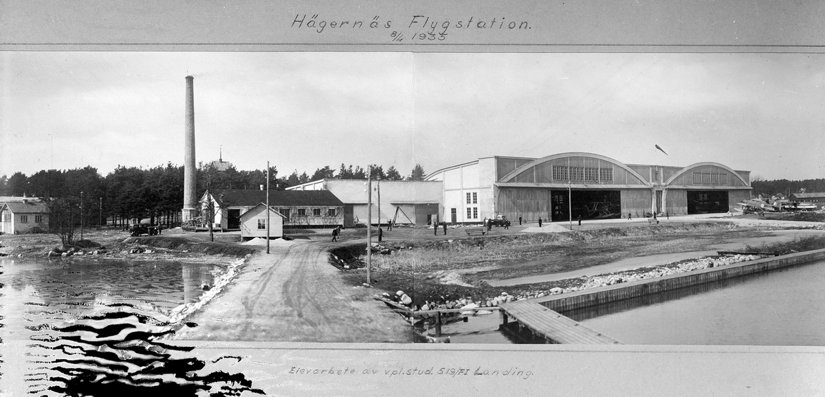 Exteriör av hangar och värmeverk på F 2 Roslagens flygflottilj, 1935. Panorama av två sammansatta fotografier.