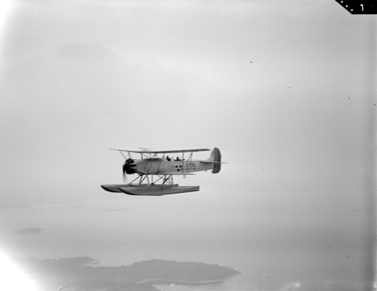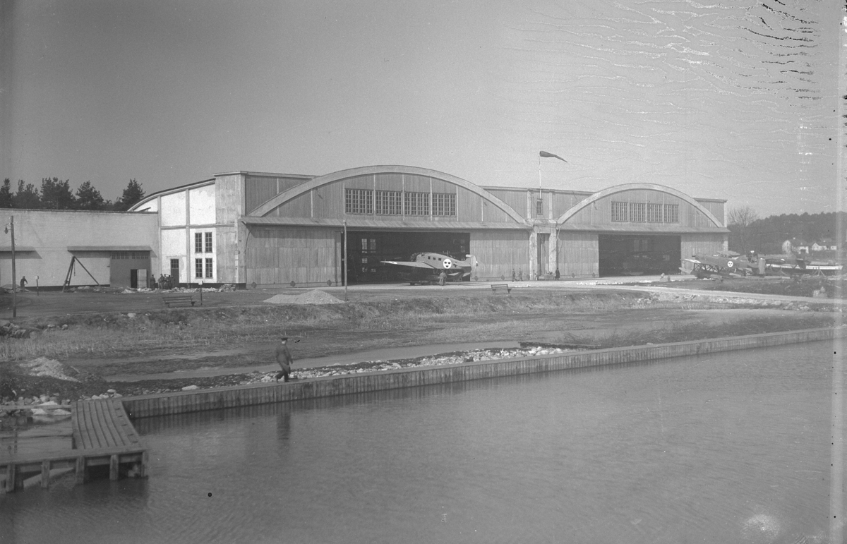 Exteriör av hangar på F 2 Roslagens flygflottilj sett från vattnet, 1935. Brygga, slip, hangar och flygplan