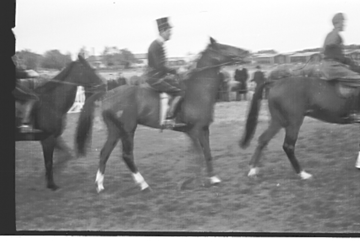 Standar och standarvakt beridna på enbart vita hästar i samband med avtäckande av livskvadronens minnessten vid Fellingsbro 6 juni 1948. Deputationer från grenadjärerna och husarerna deltog, Fellingsbros manskör sjöng