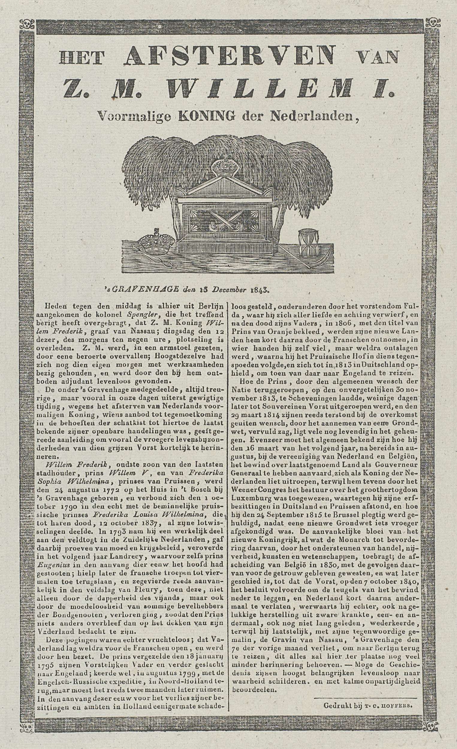 Programma voor de Begravenis van wijlen zijne majesteit Koning Willem Frederik, graaf van Nassau