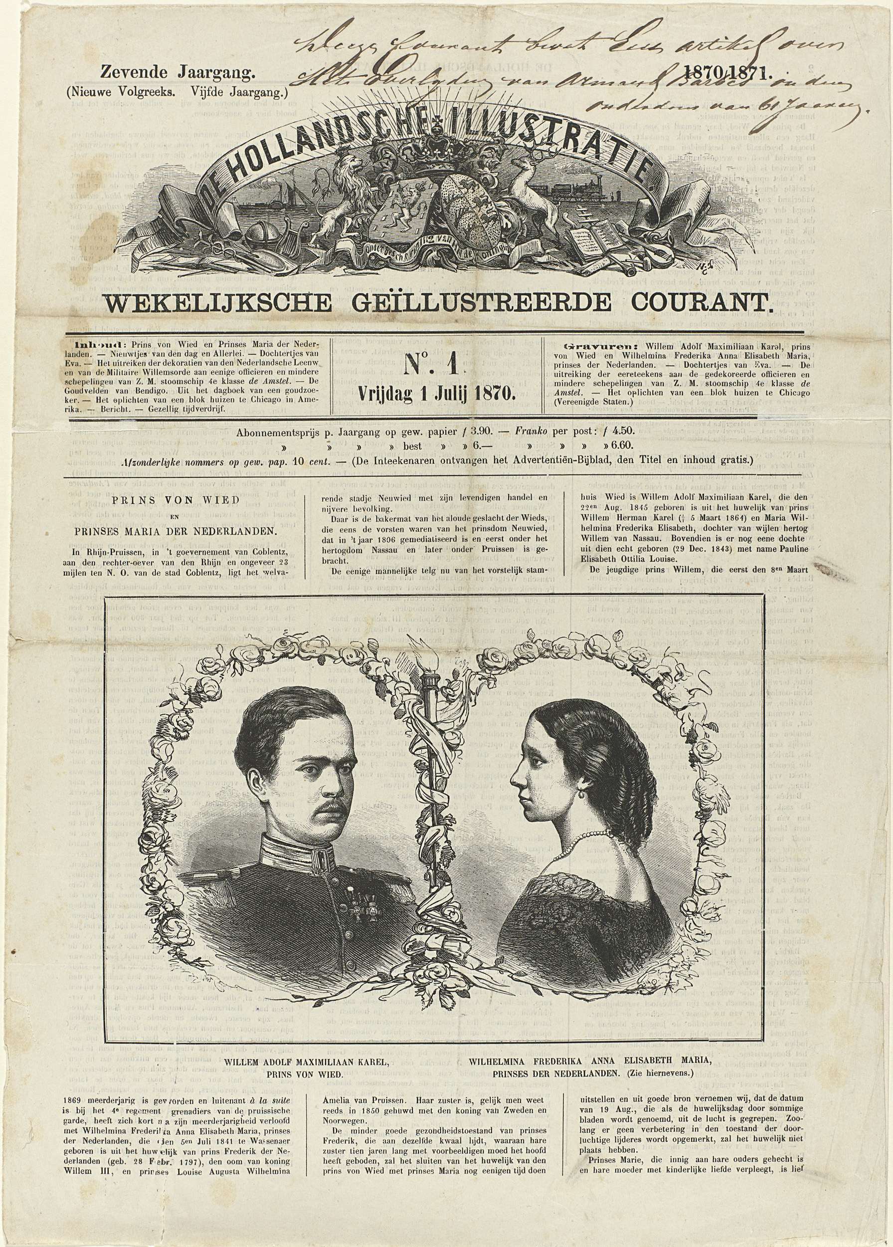 Krant met een artikel over de verloving van Willem Adolf van Wied en Marie, prinses der Nederlanden