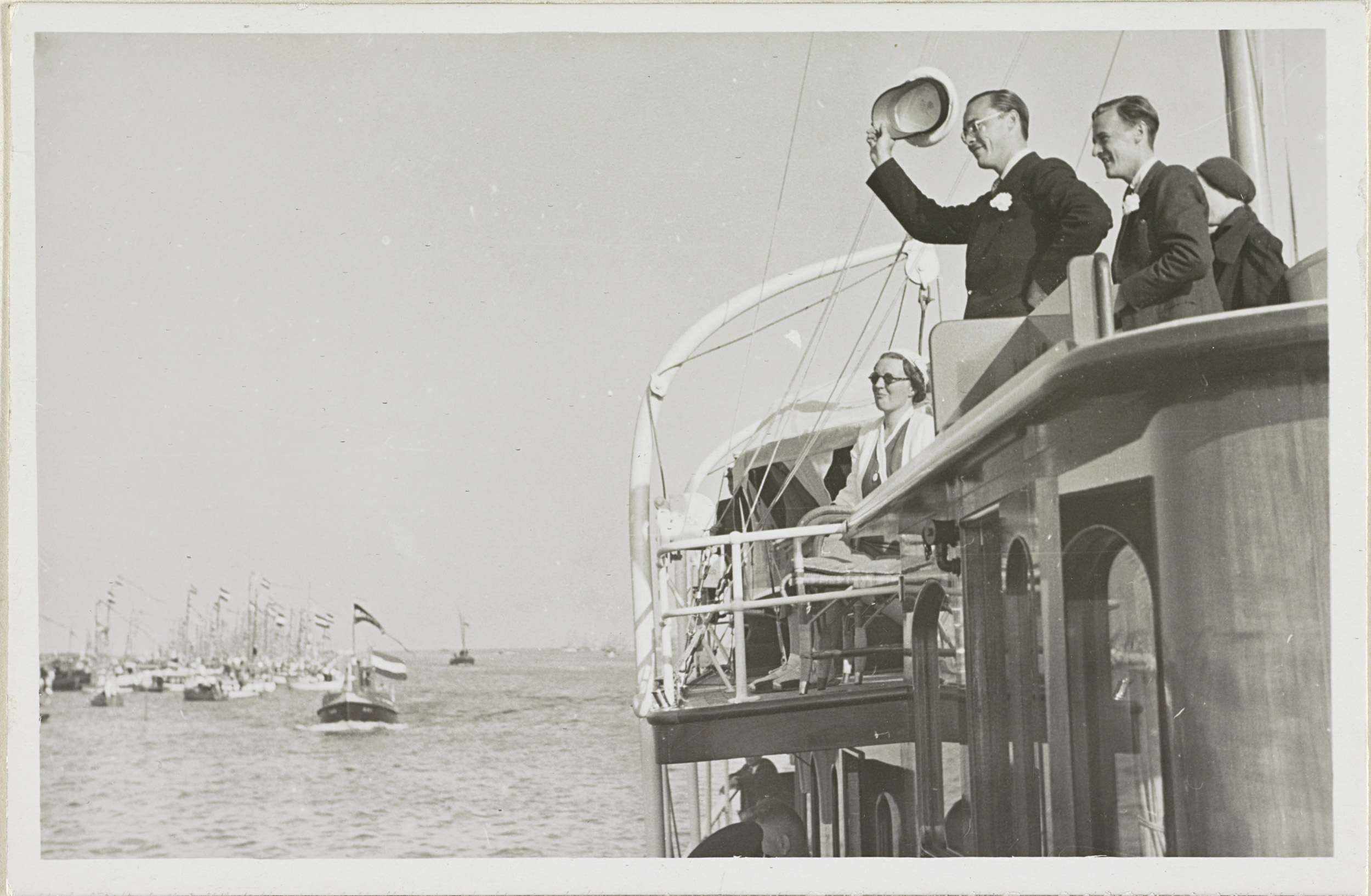 Bezoek van Juliana, koningin der Nederlanden, en Bernhard van Lippe-Biesterfeld aan het prinsenjacht Hr. Ms. 'Piet Hein' te Muiden op 28 augustus 1937