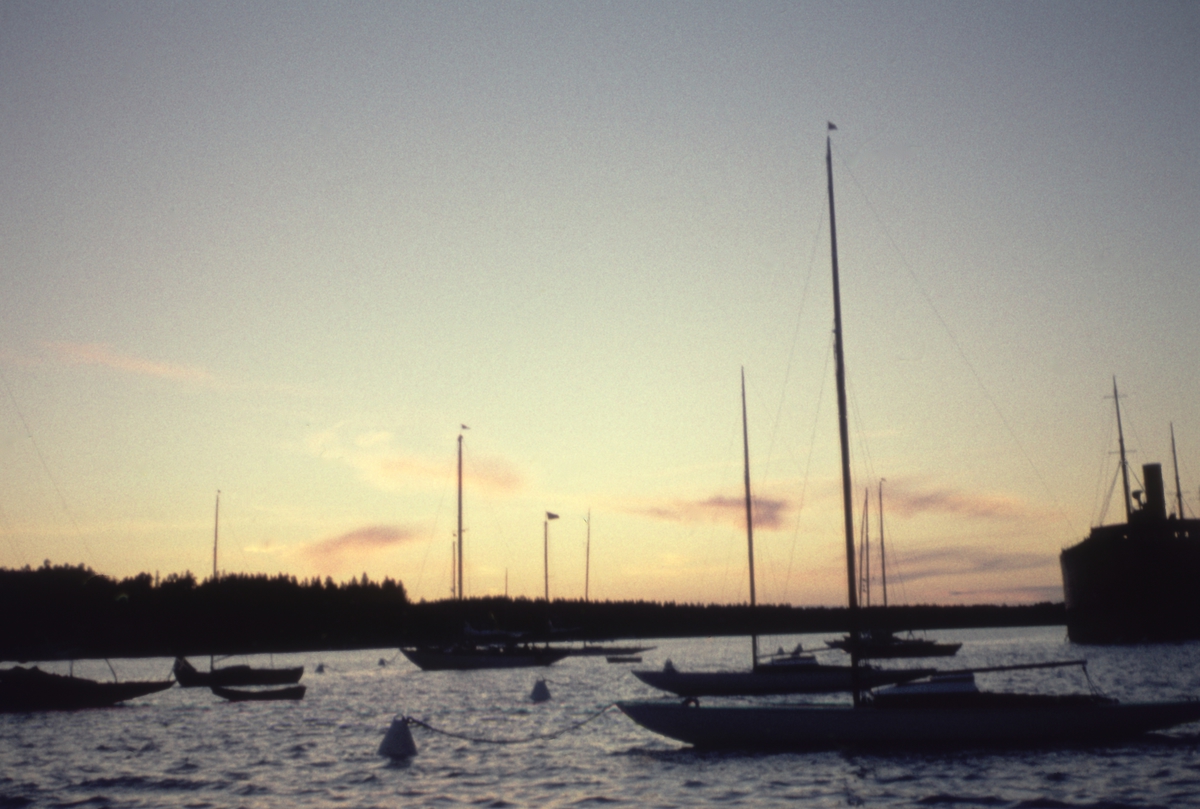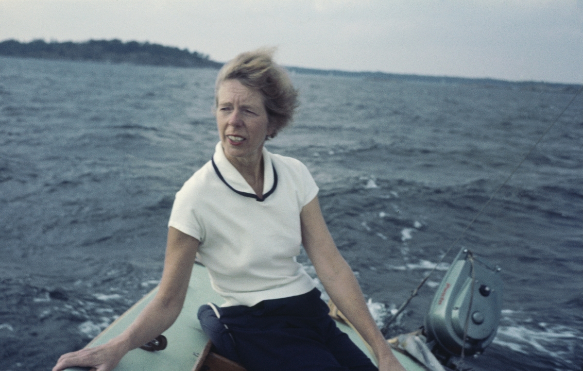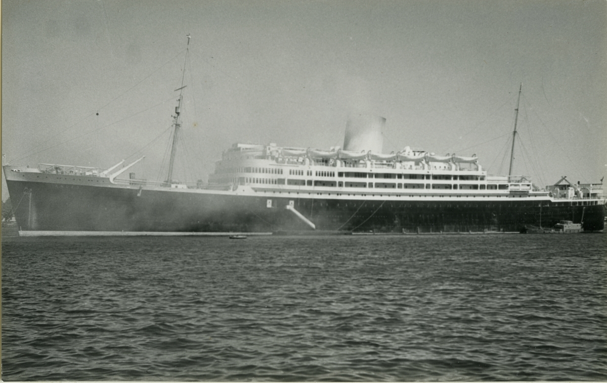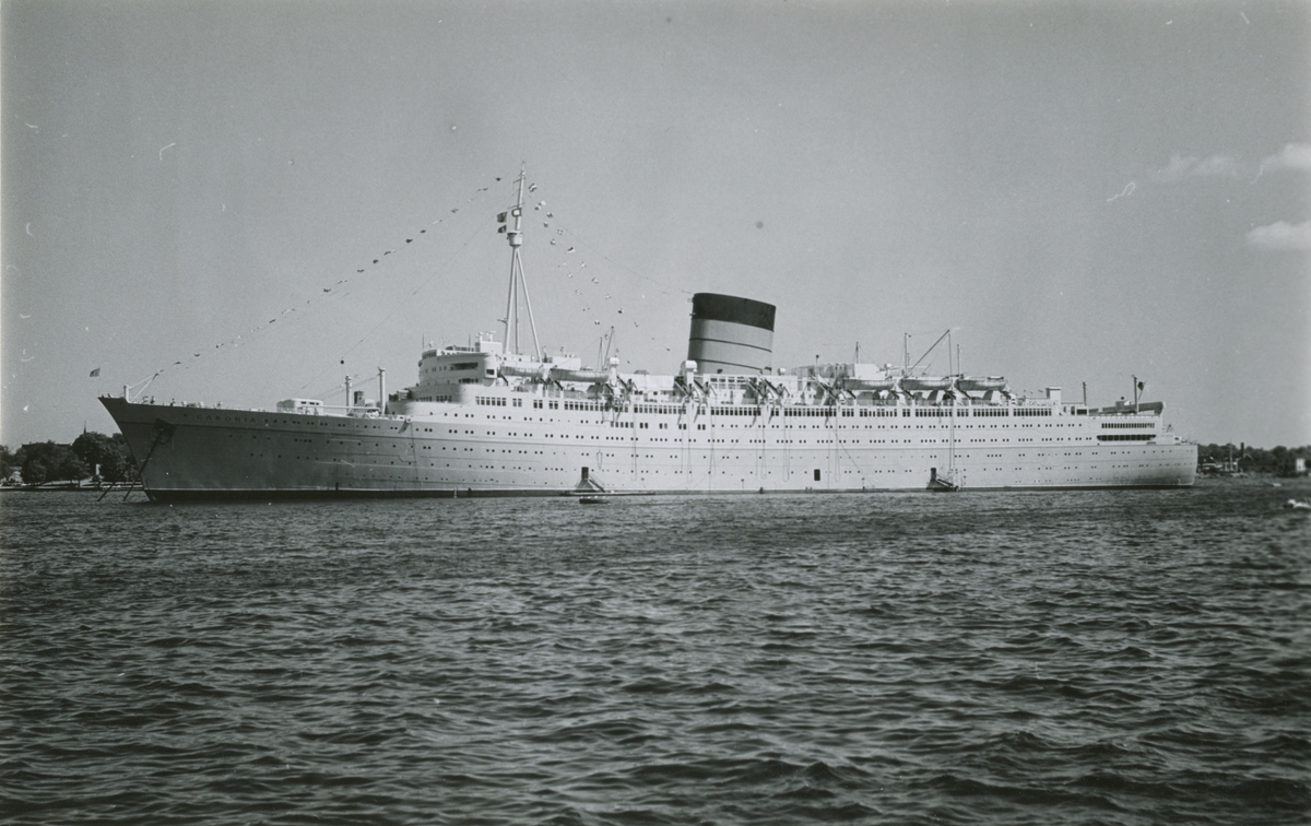 Foto i svartvitt visande turist-& passagerarturbinångfartyg CARONIA av Liverpool för ankar på Stockholms ström 1959.