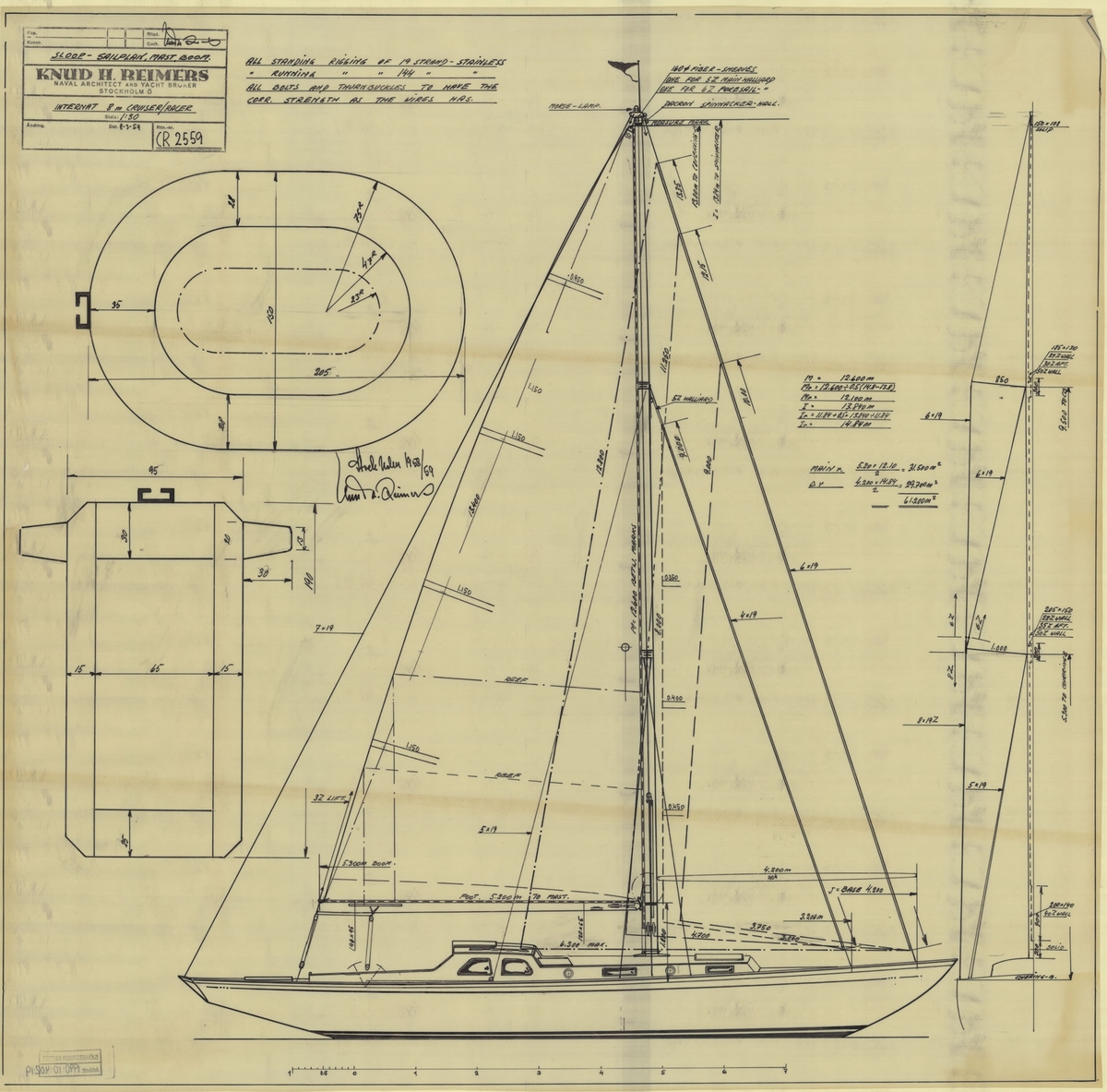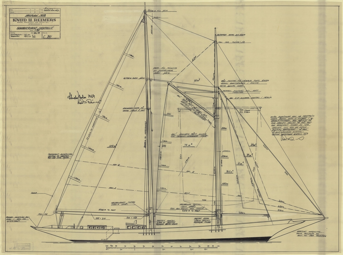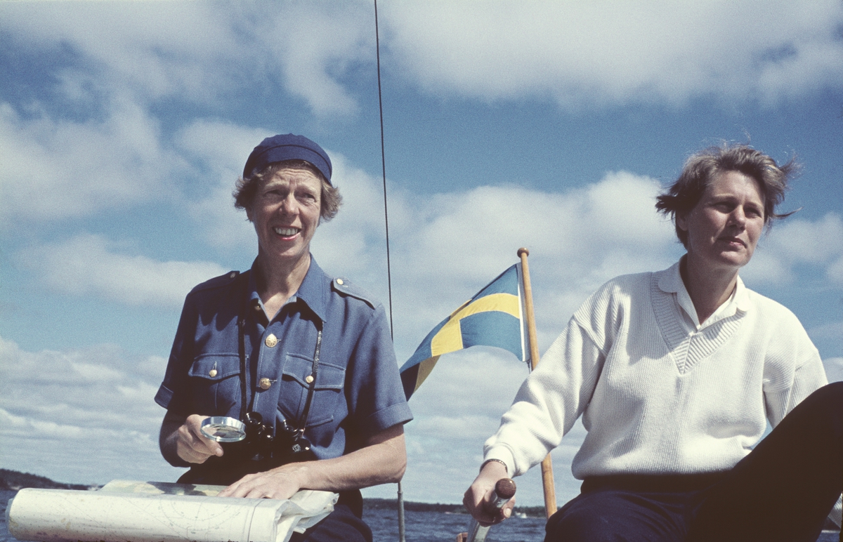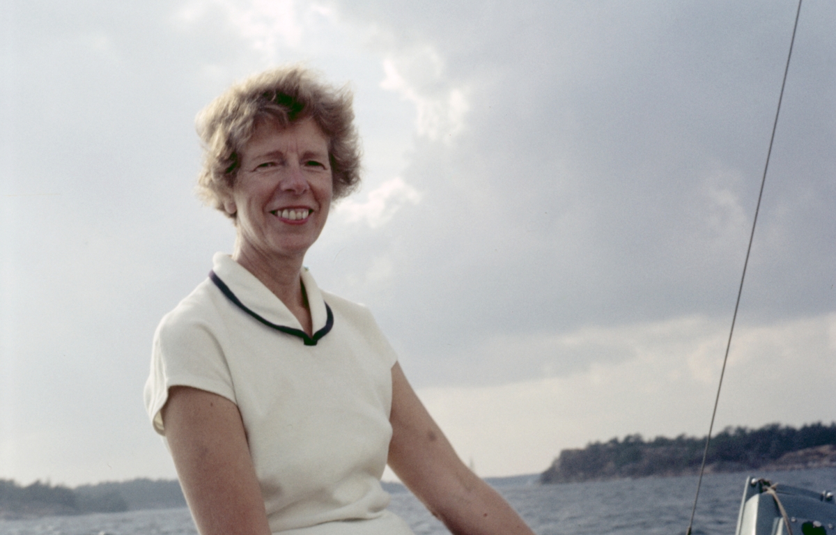 Foto i svartvitt visande turist-& passagerarturbinångfartyg CARONIA av Liverpool för ankar på Stockholms ström 1959.