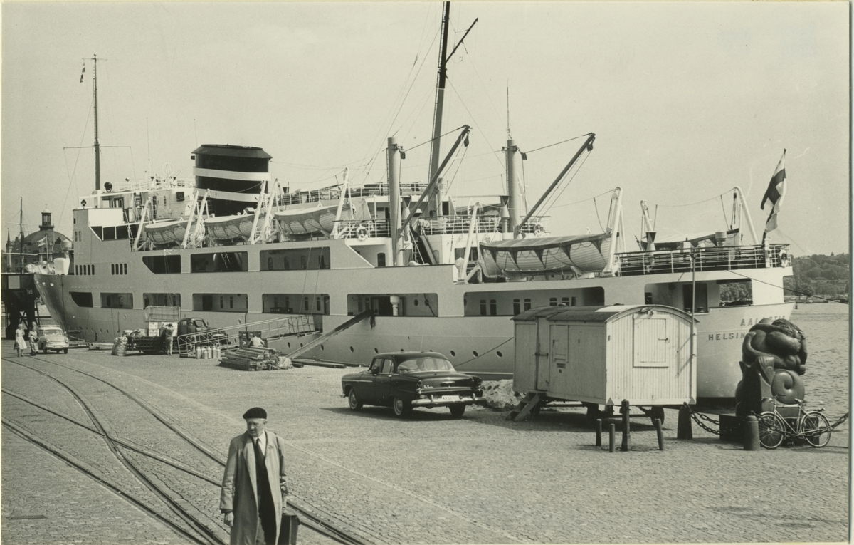 Foto från 1959 visande passagerarångfartyg "Aallotar" av Helsingfors vid kaj skeppsbron, Stockholm.