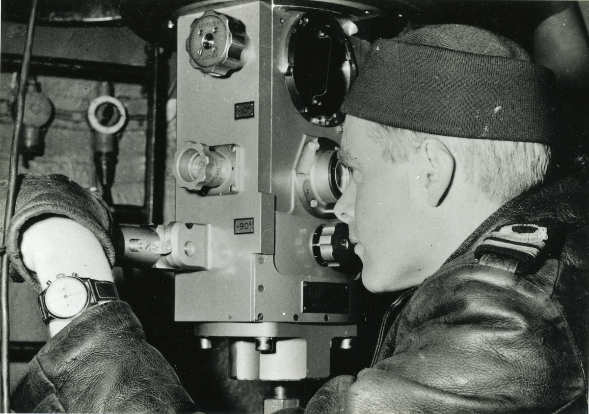 Löjtnant Jarl Eric Toussaint-Carpentier vid periskopet ombord på en ubåt.