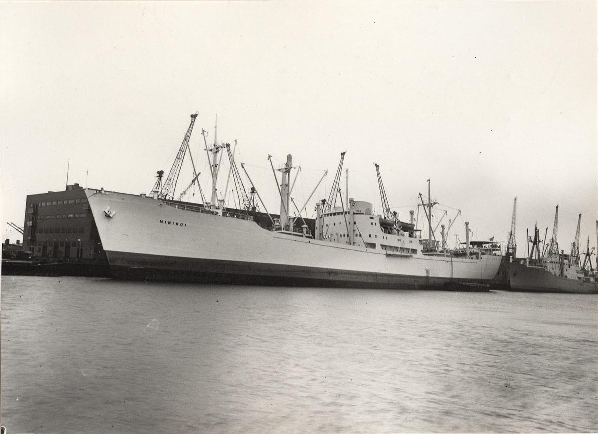 Foto i svartvitt visande lastmotorfartyget "MINIKOI" taget i Köpenhamn den 2.4.1959.