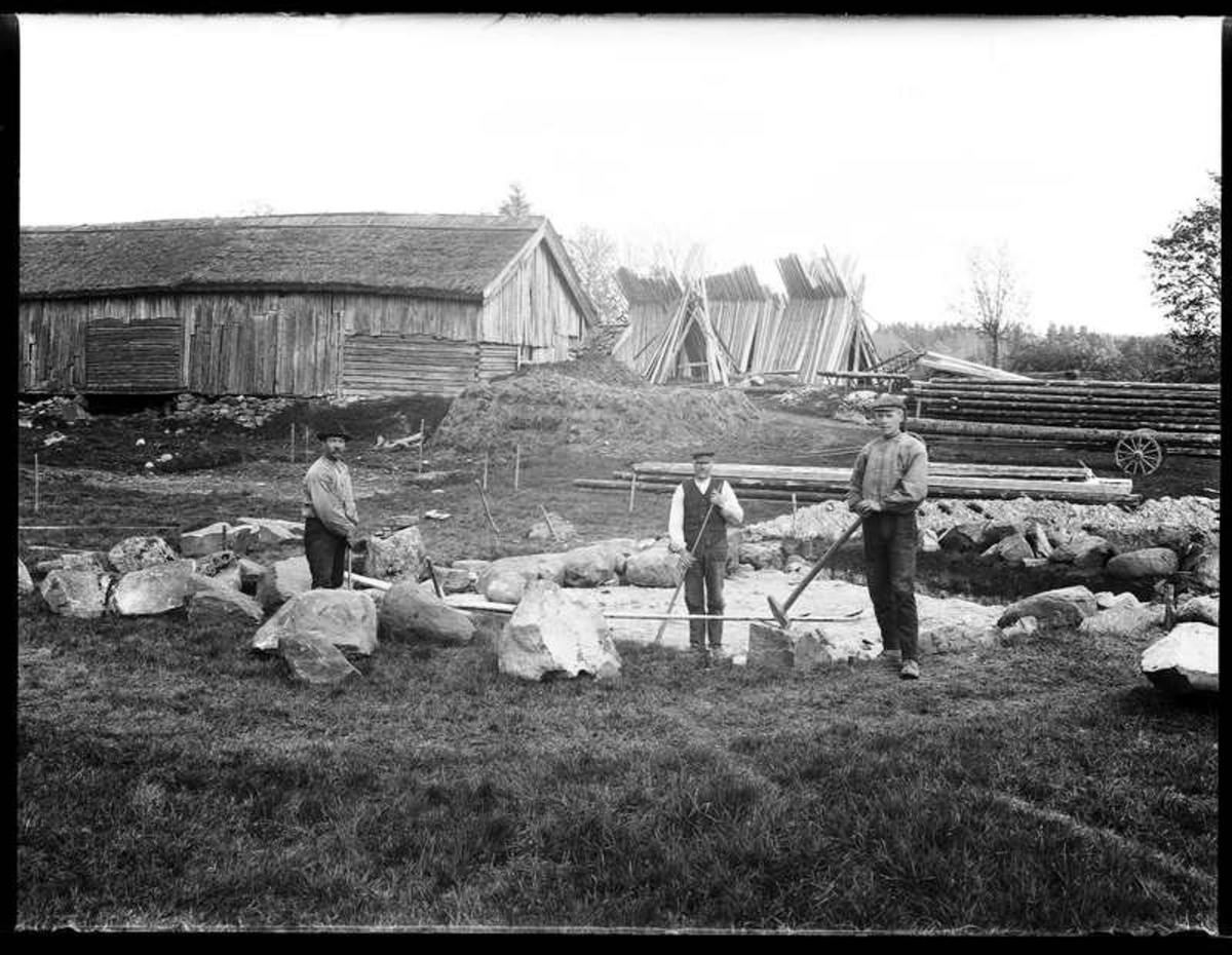 Ladugårdsgrundläggning i Brevik, 7 juni 1909. Johan Fredrik, född Hjärtum 1868-08-01, okänd, Karl Johansson, Hjärtum 1888-05-14. På bilden arbetar man med spett och slägga för att lägga grundmuren till d