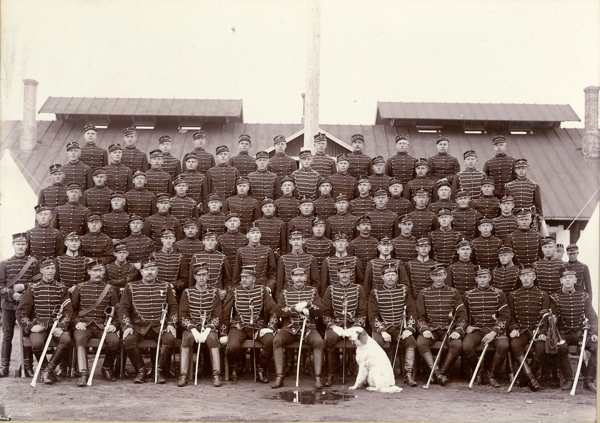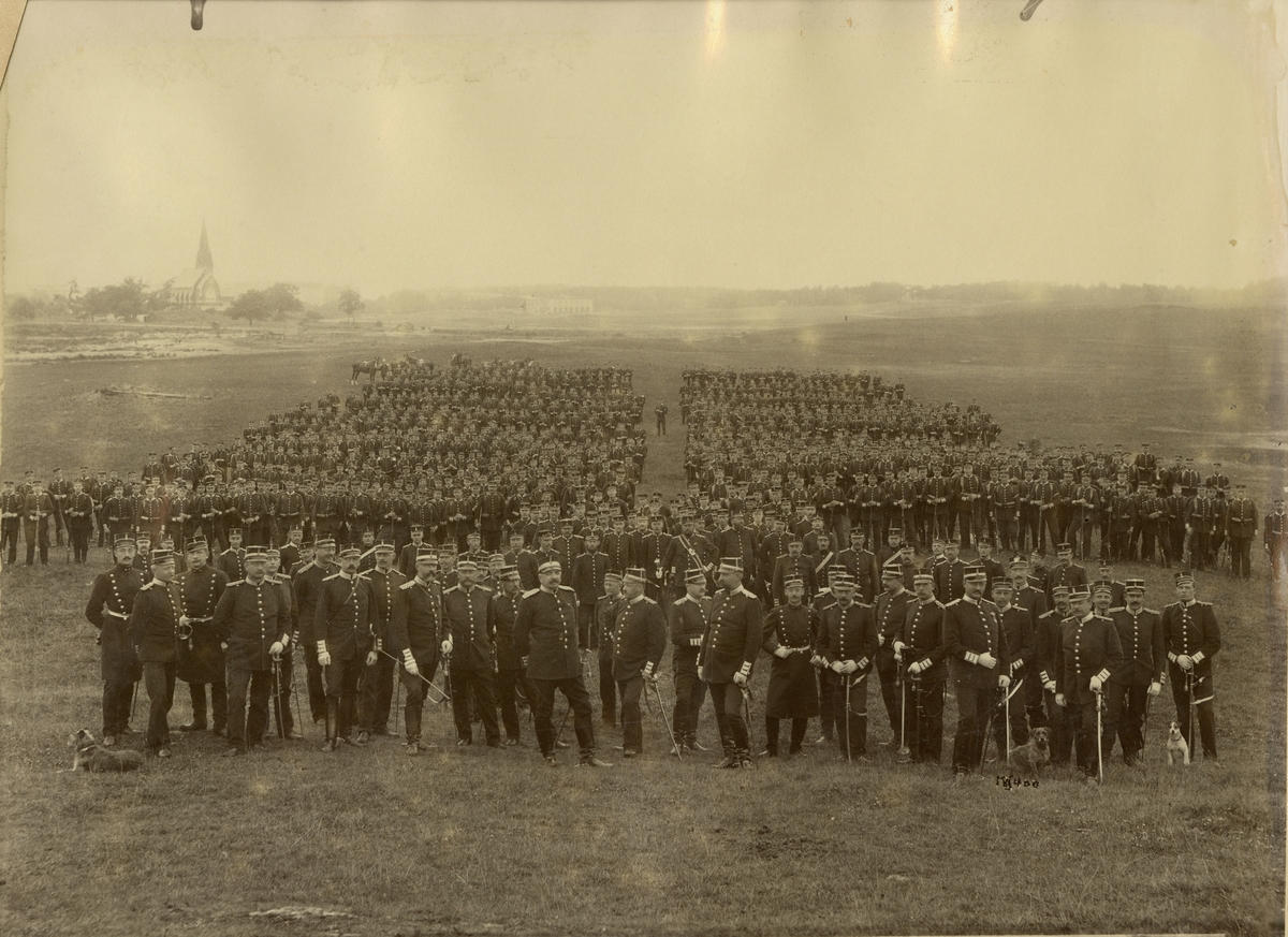 Grupporträtt av officerare och soldater från Skånska dragonregementet K 6 på Ljungbyhed, 1896.