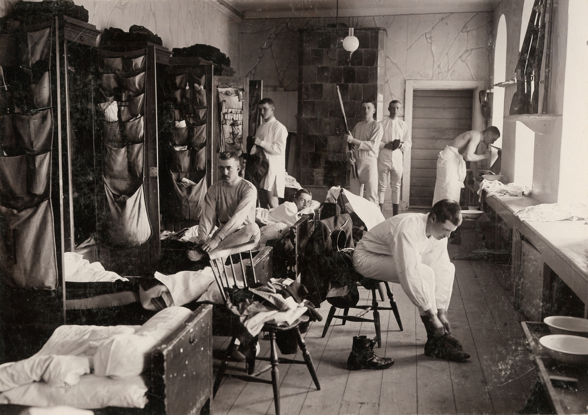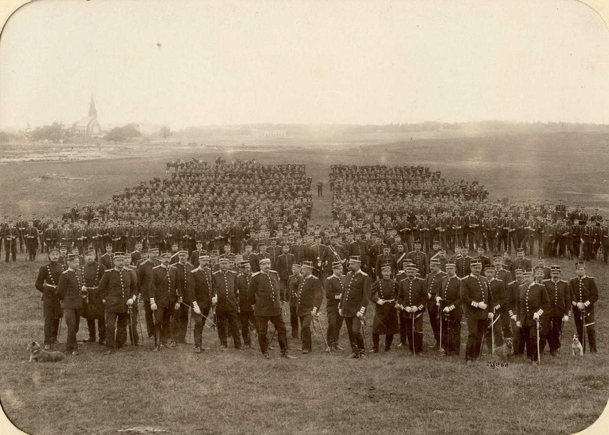 Grupporträtt av Svea livgarde I 1 på Ladugårdsgärde år 1896, i bakgrunden Gustav Adolfskyrkan.