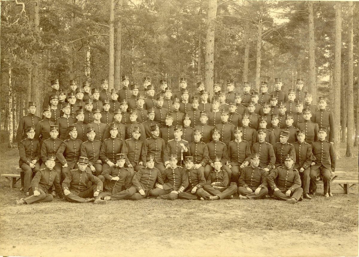 Grupporträtt av officersaspiranter i skog utanför Karlsborg 1896-1897.