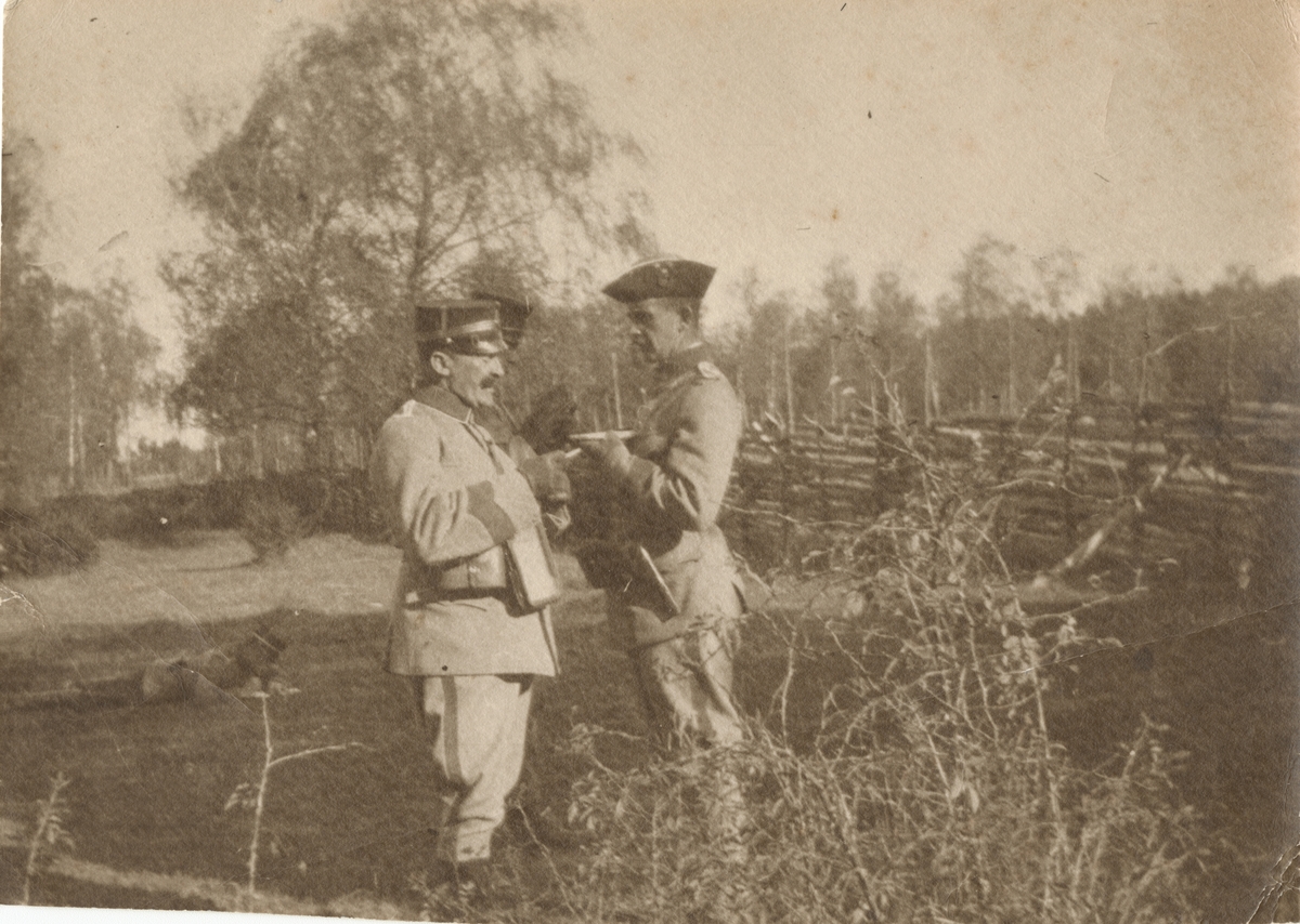 Nedrebilden, officerare i vinteruniform på skidor.