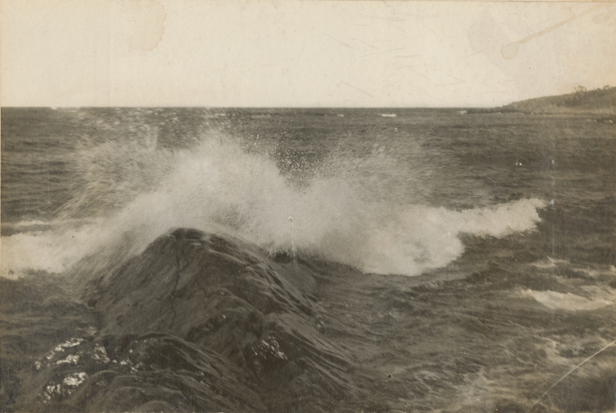 Naturbild på havet med kraftiga vågor som slår mot strandklippor.