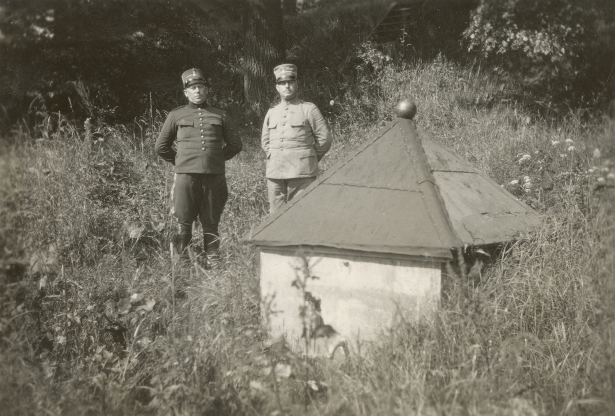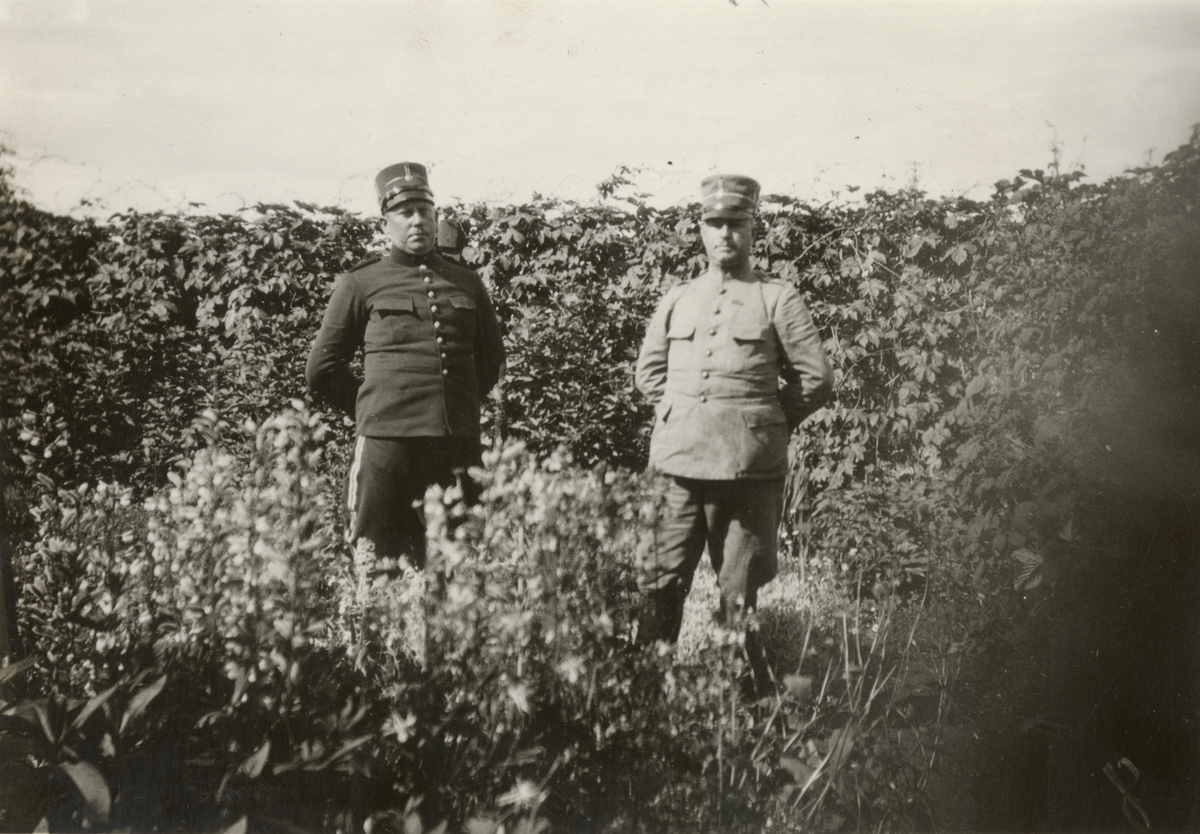 Två soldater från Södra skånska infanteriregementet I 25 i trädgården.