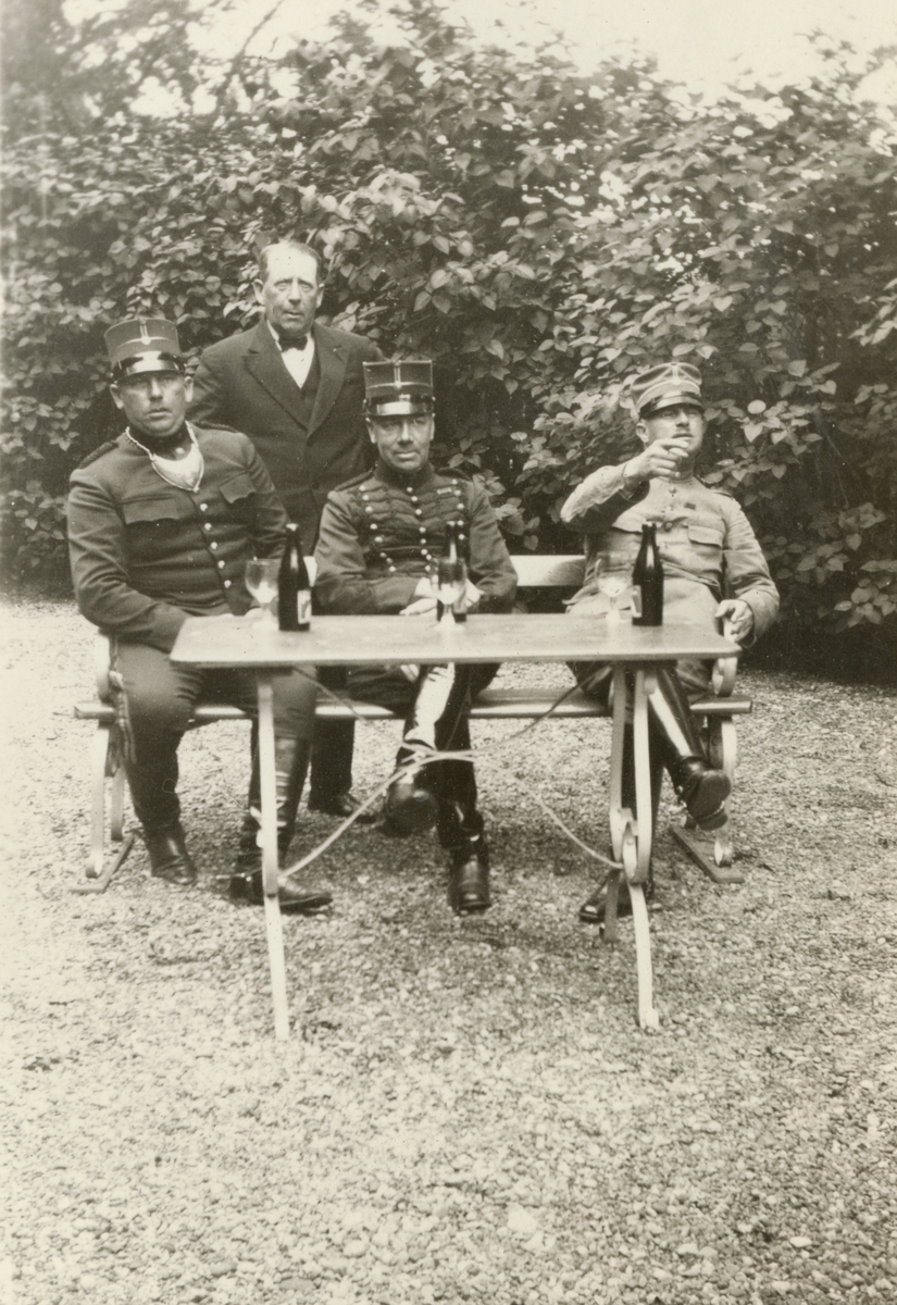 Tre soldater från Södra skånska infanteriregemente I 25 samt en civil vid ett trädgårdsbord.
