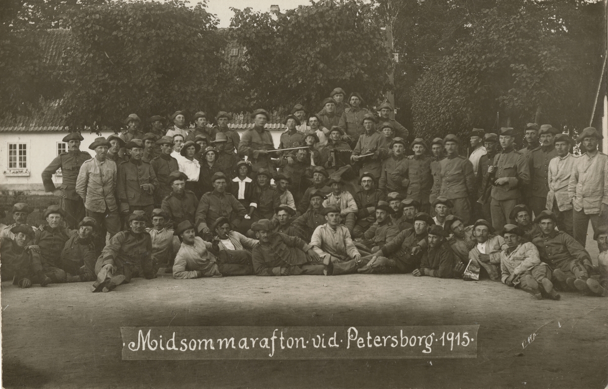 Gruppbild med soldater från Södra skånska infanteriregementet I 25 framför en byggnad.