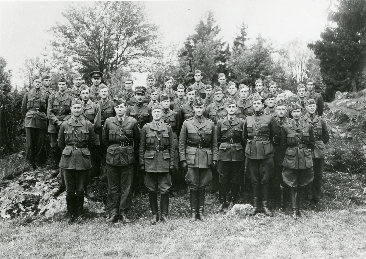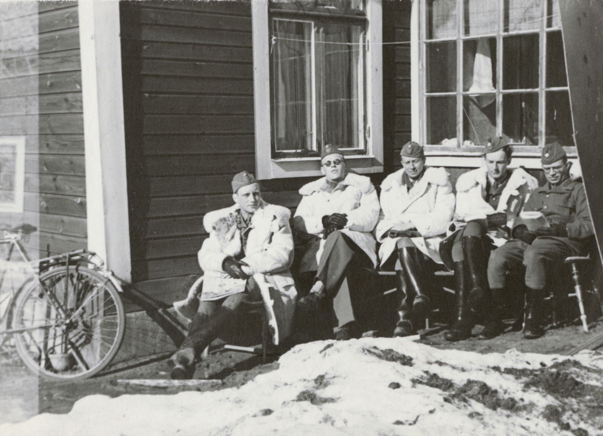 Officerare från Södermanlands regemente sittande vid ett hus.