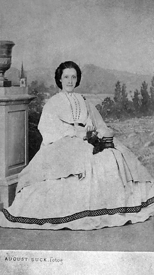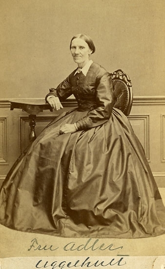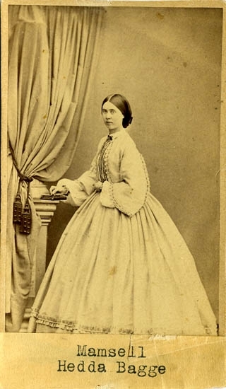 Text på kortets baksida: "Mamsell Hedda Catharina Bagge 28 år 1864. Hedda Catharina bagge fädd 1836 gift 1866 med Axel Ferdinand Bildt född 1823. Major vid Bohusl. regemente".