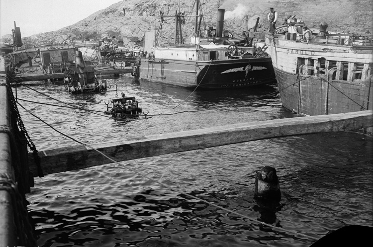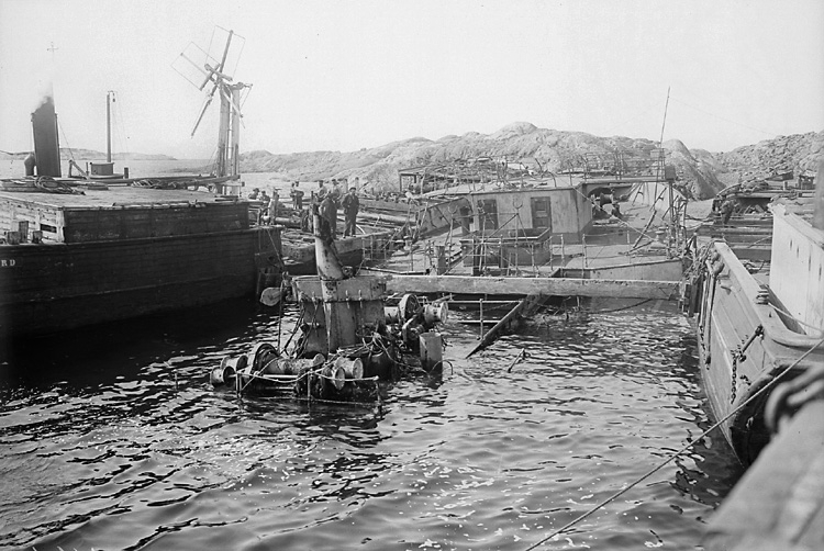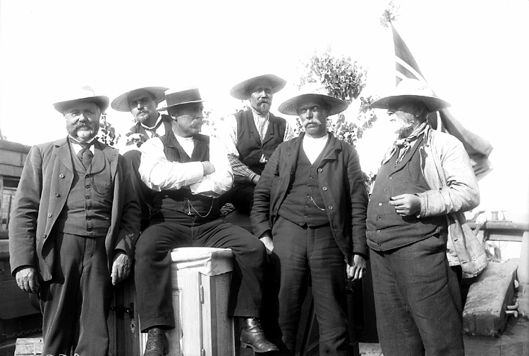 Sex män i skjortärmar och s.k. panamahattar (de flesta), vid bärgningen av S/S "Ekliptika".