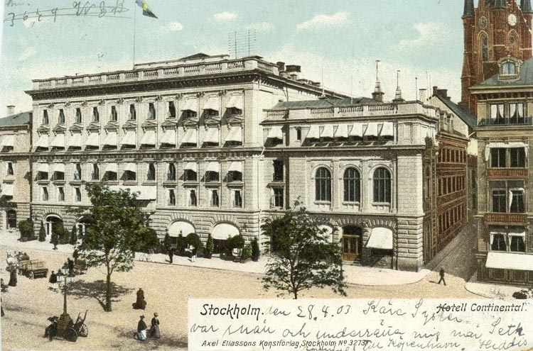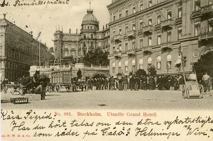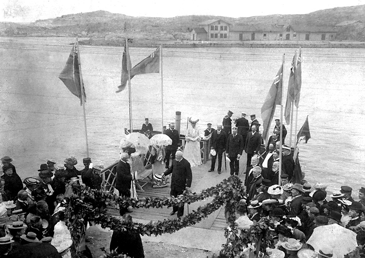 Kung Oscar II hälsas välkommen på Kungsplan av grosshandlare Carl Wijk, greve August von Rosen, grevinnan Mathilde De la Gardie och överhovjägarmästare Victor Ankarcrona (Böllinger).