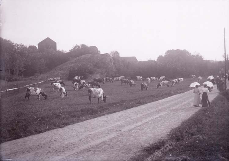 Landsväg. Betesmark. Betande kor på en äng.