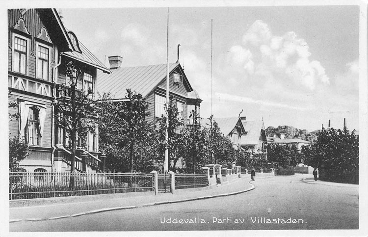 Tryckt text på vykortets framsida: "Uddevalla Parti av Drottninggatan".