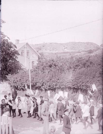 Enligt senare noteringar: "IOGTlogen Munkedal, i demonstrationståg utanför Oscar Färdigs fastighet. Det är troligen förbudsomröstningen 1922, som är föremålet för tåget.