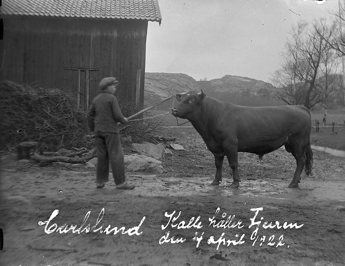 Enligt text på fotot: "Carlslund. Kalle håller tjuren den 4 april 1922".