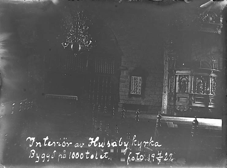 Enligt text på fotot: "Interiör av Husaby kyrka. Byggd på 1000talet, foto 4/7 1922".