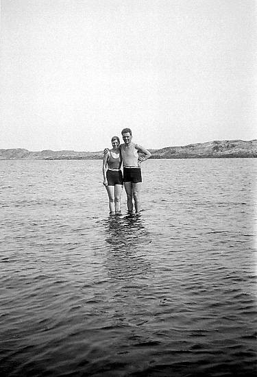 Pher och Ragnhild Bonander, iklädda badkläder, står och håller om varandra ute i viken vid "Utkäften", Klåverön.