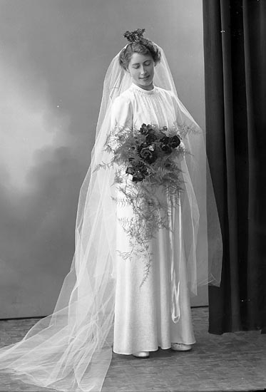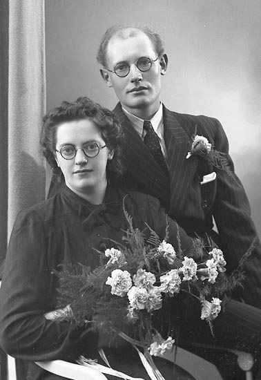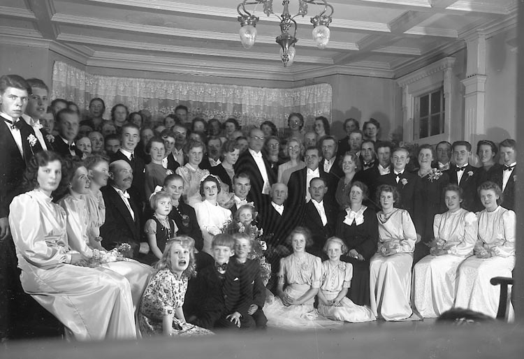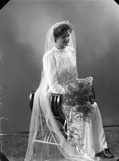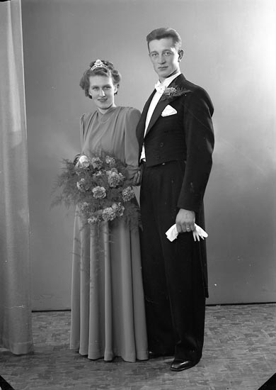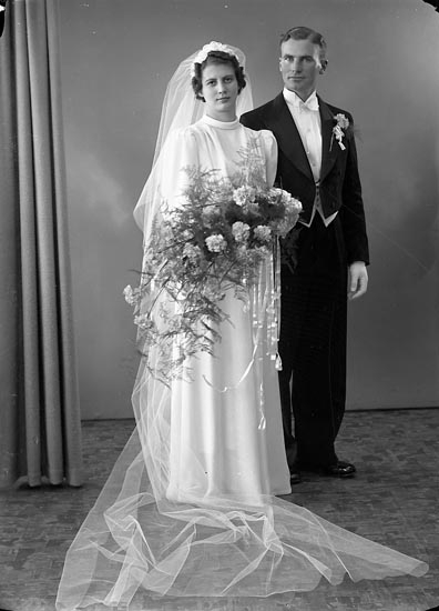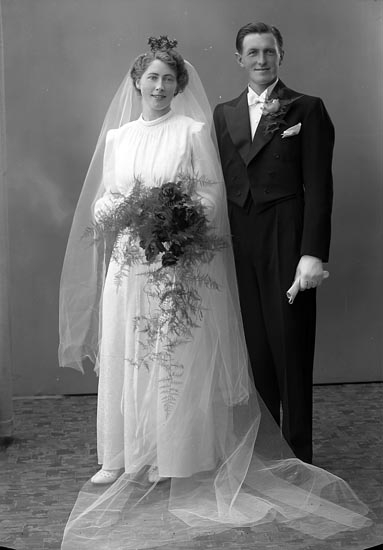 Enligt fotografens notering: "Brudparet LarssonFredriksson i bröllopsgård Stenungsgård".