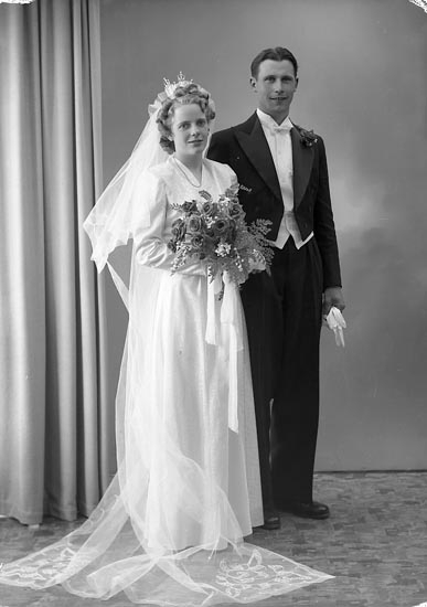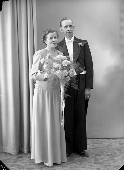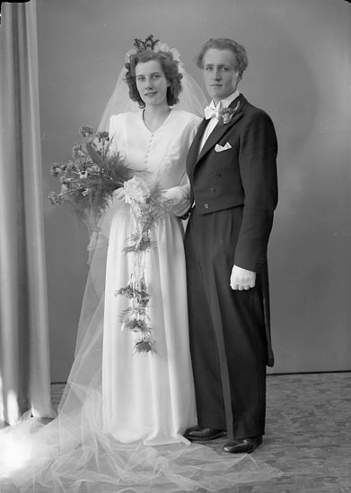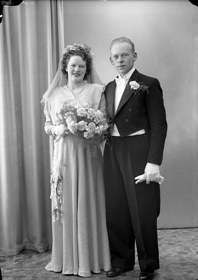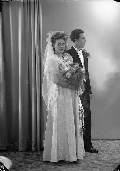 Enligt fotografens notering: "Brudparet Ingrid Oskarsson Helge Wilhelmsson, Nordanvindsg. 4 B Gbg".