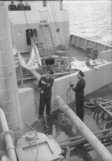 Dop och sjösättning av fartyg 139 M/T Faunus. Fartygets gudmor med bland andra Gustaf B. Thordén.