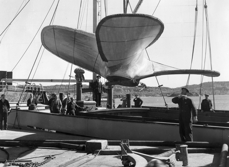 Sjösättning av fartyget 138 M/S Clary Thordén. Gustaf och Clary Thordéns son Edvard med sin mormor Hjördis Johansson i förgrunden.