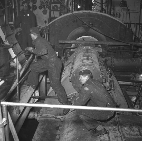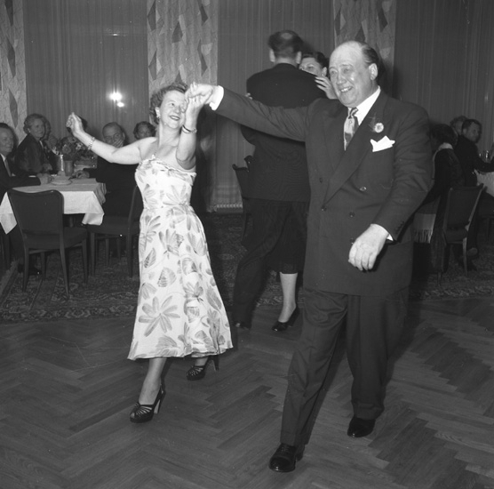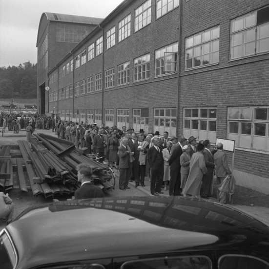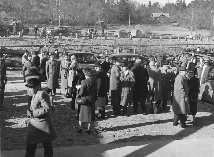 Vid dop och sjösättning av fartyget 133 T/T Josefina Thordén. Det var Sveriges första stora tanker. Personerna på bilden köar för att komma in till den ena sjösättningmiddagen.