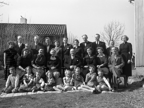 Gruppfoto på släkten Hansson, Kikerud Valbo Ryr. I bakgrunden skalden och professorn, Pontus Wikners fördelsehem.