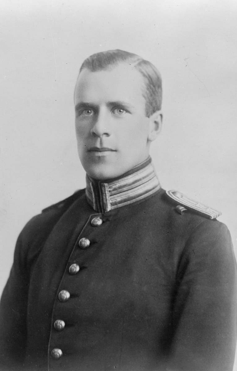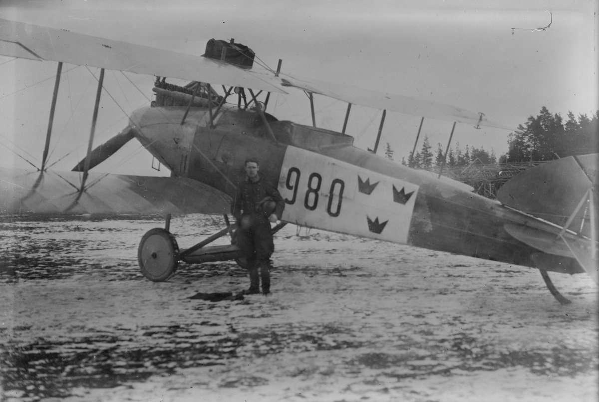 Flygförare Nils Rodéhn framför flygplan FVM S 18 nummer 980 på Malmen, vintertid.