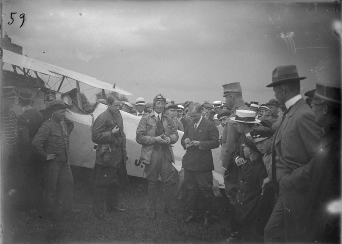 Folksamling vid ett franskt militärt flygplan Bréguet XIV vid mellanlandning på Malmen, 1919.