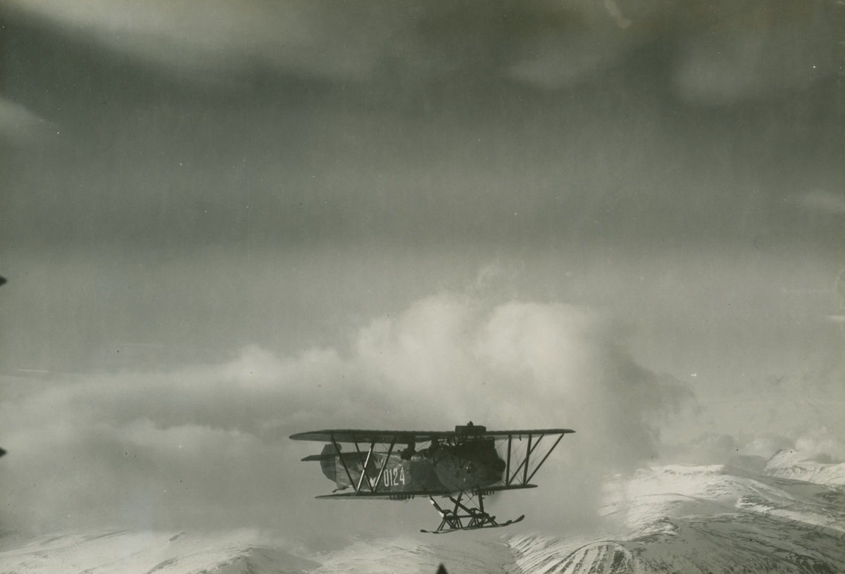 Flygplan FVM S 18 märkt nummer 980 med flygförare och flygspanare flyger över Malmen vintertid. Flygplanet utrustat med skidor.