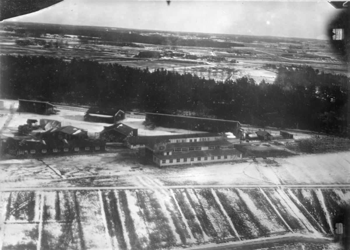 Militärer och flygare framför flygplan AEG G.V vid landning utanför Kristianstad under leveransflygning år 1919. Flygplanet var på väg till Flygkompaniet på Malmen.
