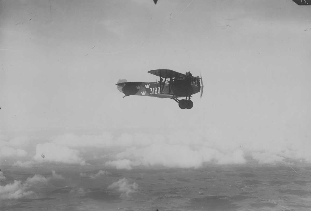 Flygplan FVM S 18 märkt nummer 982 står uppställt på ett flygfält på Flygkompaniet på Malmen. Militärer står omkring flygplanet.
