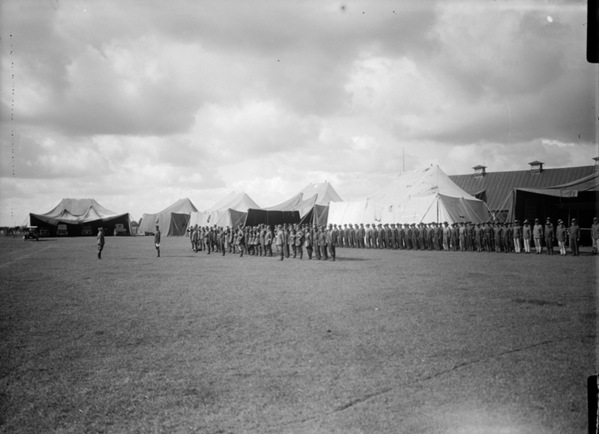 Flygstationen i Rinkaby. Manskap uppställt framför tälthangarer. General Karl Amundson inspekterar.
