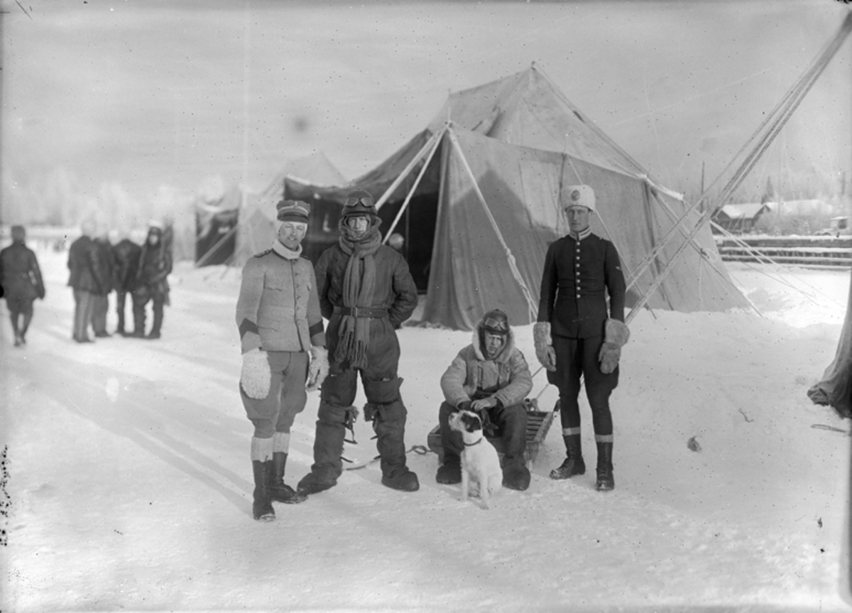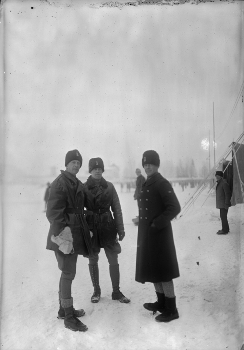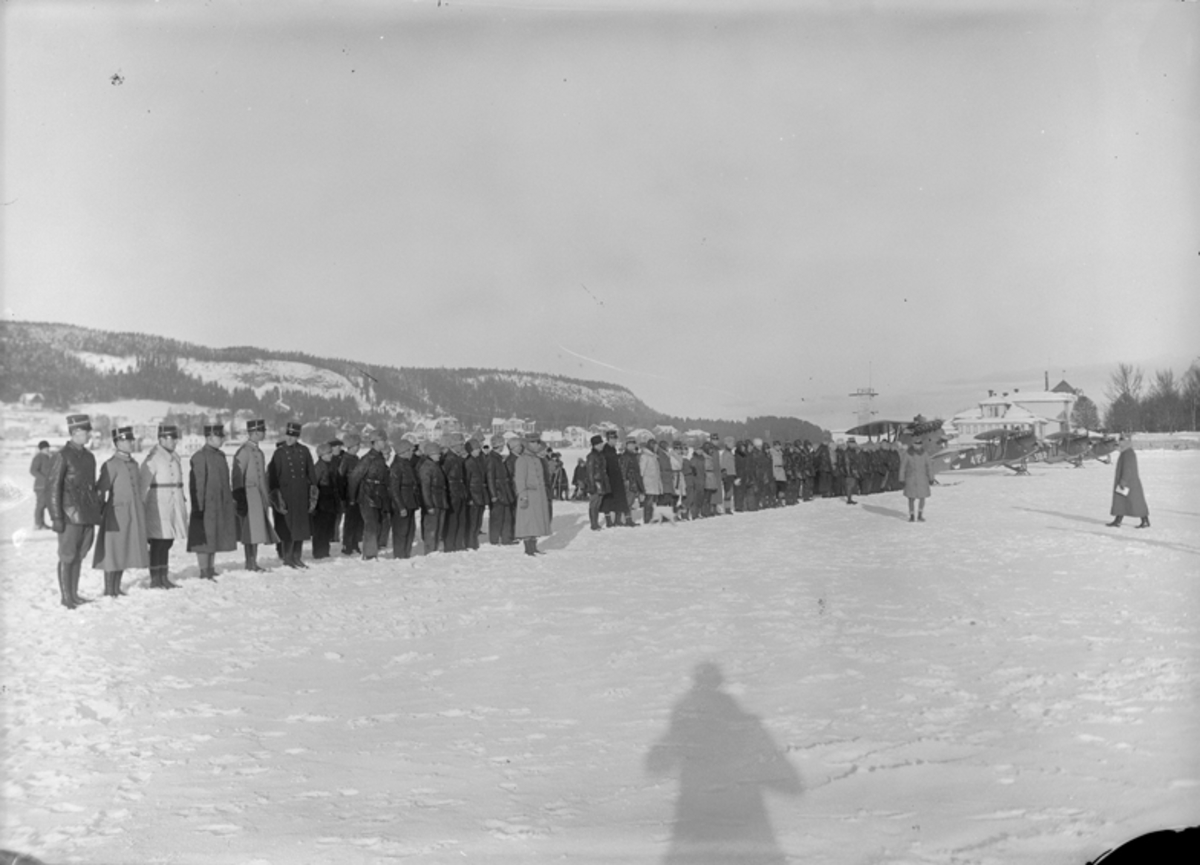 Inspektion på flygstationen i Östersund, vintertid, 1926. Militärer på rad. I bakgrunden syns flygplan.